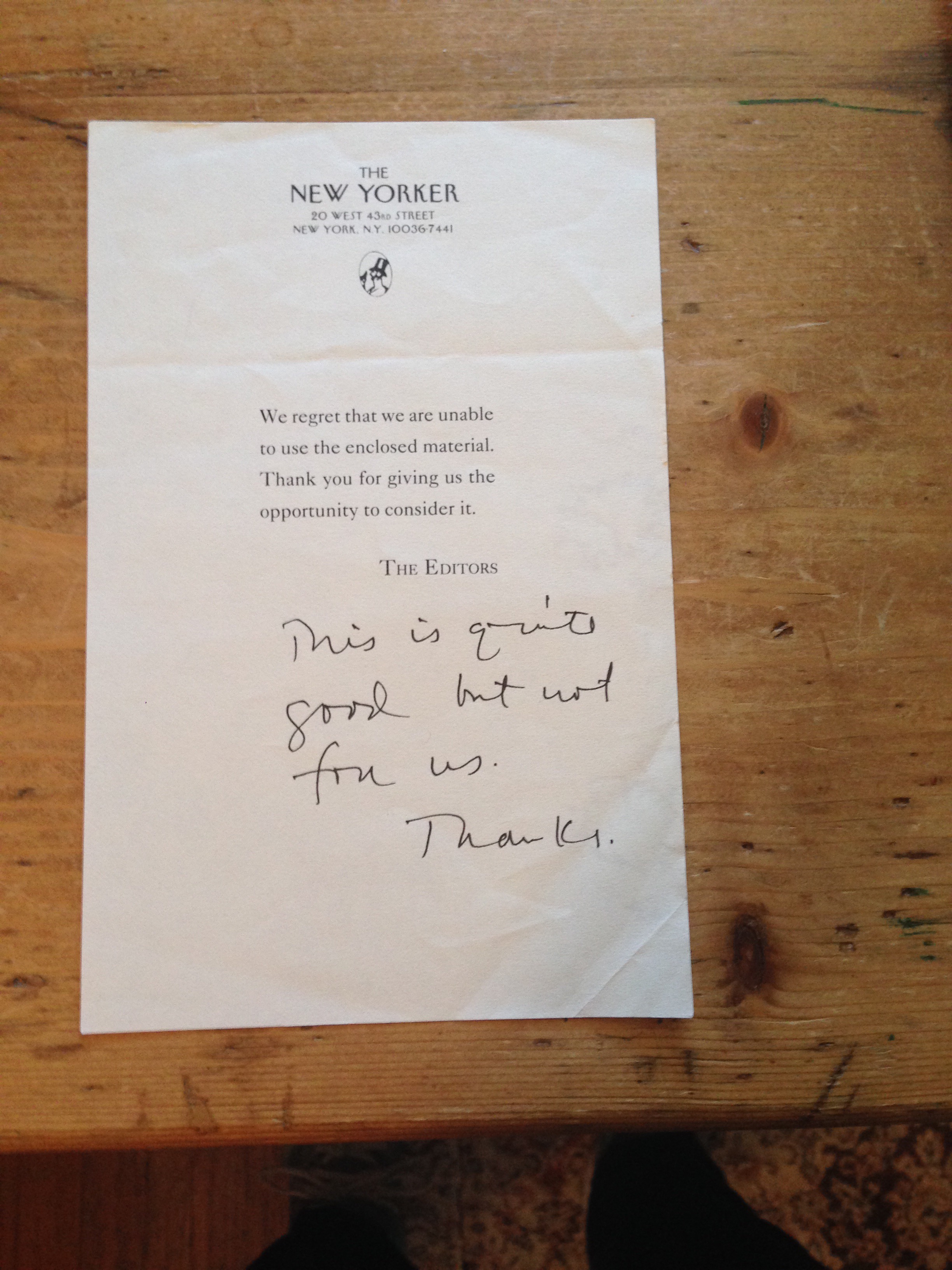 Here is a note I got years ago from an editor at The New Yorker (when I once had the nerve/guts to send them a short story). In writer pep talks, they always say that a handwritten personal note means something. I still haven’t figured out what…